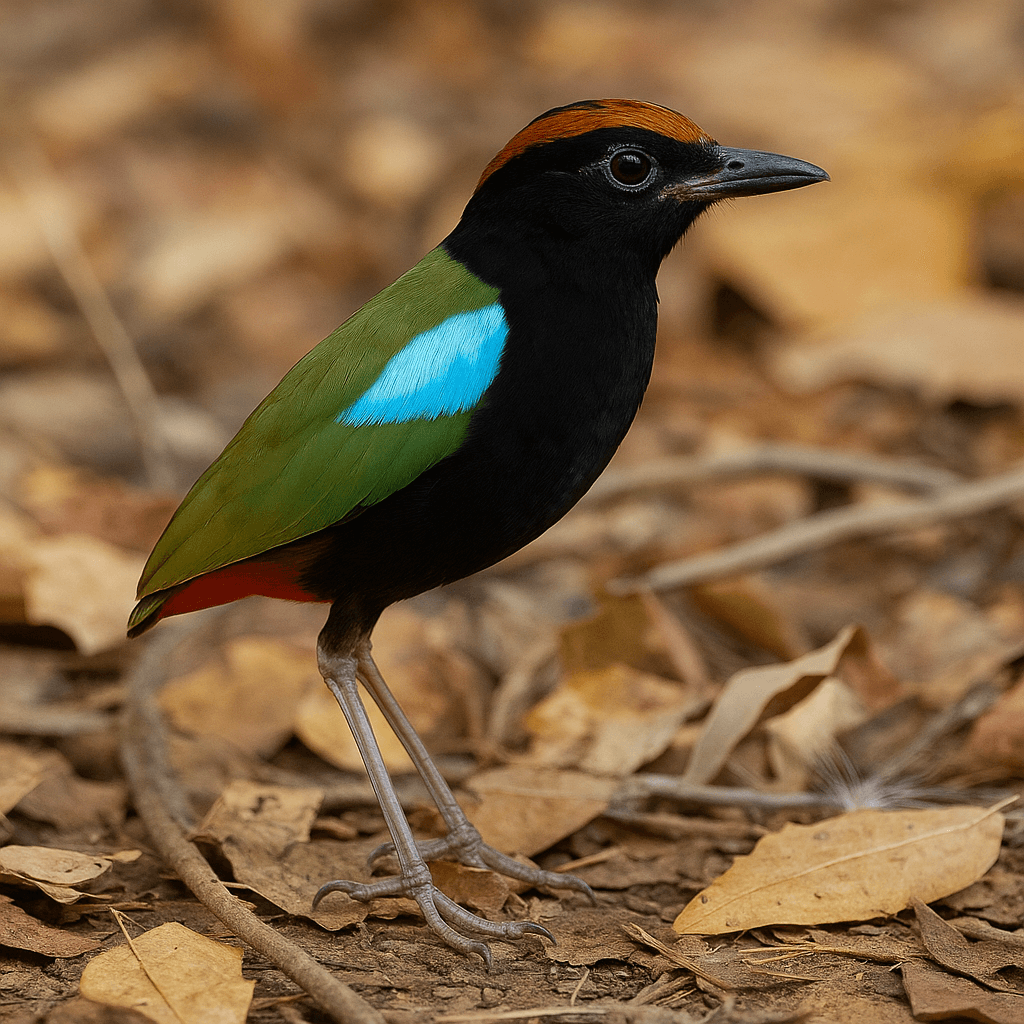 Rainbow Pittas feed mainly on insects, small invertebrates, and worms. They forage on the ground, flicking leaf litter aside with their beaks to uncover prey.